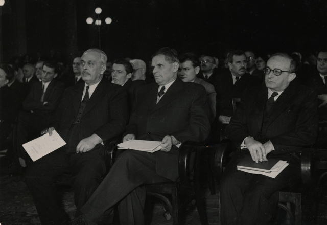 Az 1951-es nagygyűlés ünnepi megnyitó ülésén (1951. dec. 9.) részt vevő állami vezetők: Rónai Sándor, a Magyar Népköztársaság Elnöki Tanácsának elnöke, a Magyar Dolgozók Pártja Politikai Bizottságának tagja, Dobi István, a minisztertanács elnöke, Friss István, a Magyar Dolgozók Pártja Központi Vezetőségének tagja. (Akadémiai Levéltár, Fényképtár 1517)1956 áprilisában azonban összehívtak egy rendkívüli, alapszabály-módosító közgyűlést, ez volt a 116., majd május végén sor került a 117. rendes közgyűlésre, amelyen tisztújítás és tagválasztás is volt.