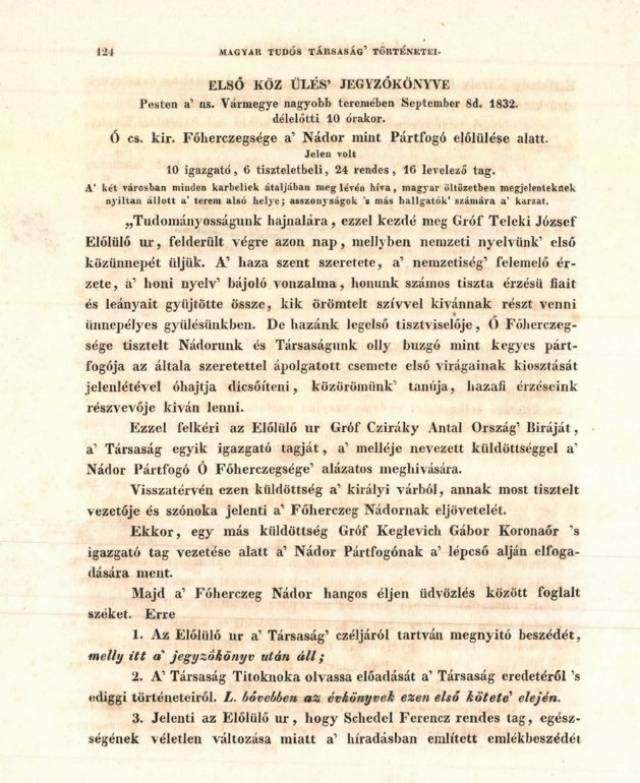 E szerint az ülésen jelen volt a nádor, 10 igazgató, 6 tiszteletbeli, 24 rendes és 16 levelező tag. Először az elölülő (elnök), Teleki József beszélt a társaság céljairól, majd Döbrentei Gábor titoknok (főtitkár) számolt be a társaság addigi történetéről, utána Nyiri István rendes tag székfoglaló előadása hangzott el „a’ fa és kőhid erő hasonlati meghatározásáról”, majd Kölcsey Ferenc emlékezett meg Kazinczy Ferencről. Az ülésen még részleteket olvastak fel Kisfaludy Sándor új regéjéből, a Kemendből, és kiosztották az első jutalmat Pázmándi Horvát Endrének Árpád című művéért.