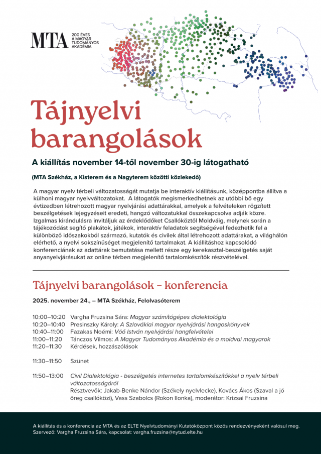 „Tájnyelvi barangolások” címmel interaktív kiállítás nyílik az MTA Székházában, a Kisterem és a Nagyterem közötti közlekedőben, amely november 14. és 30. között látogatható. A kiállításhoz kapcsolódó konferenciára 2025. november 24-én kerül sor.