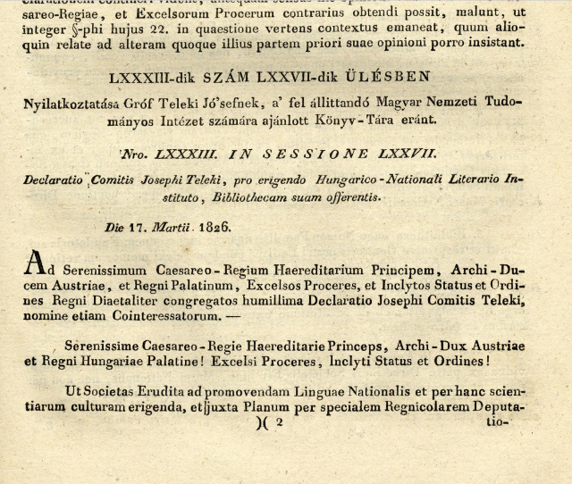 A Teleki család könyvtárának felajánlása a „fel állitandó Magyar Nemzeti Tudományos Intézet számára”, 1826. március 17., parlamenti törvények, részletForrás: MTA KIK