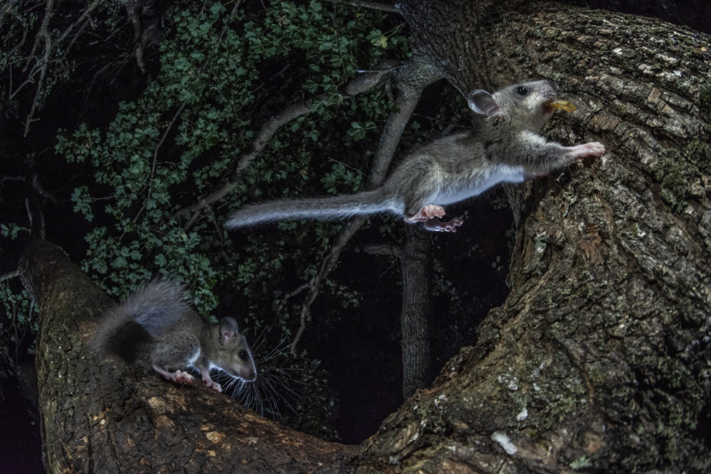 Nagypele-kölykök éjszakai felfedezőútja a lombkoronában. Két nyári szezonon keresztül, összesen 42 estén át fotóztam és figyeltem a védett gombszeműek életét. Elsősorban nagylátószöggel szerettem volna bemutatni őket úgy, hogy élőhelyükön, vagyis odafent, a fák ágai közt mutatkozzanak esti hangulatban. Az állványt, fényképezőgépet estéről estére felkötöztem egy magas ághajlatba, és ugyanitt fixen rögzítettem egy mozgásérzékelő rendszert is. Időnként én is kint maradtam, és órákon át egyensúlyoztam a létra tetején, ilyenkor magam exponáltam, illetve a mozgásérzékelő és a reflexeim sokszor egymást segítették. A második szezon utolsó előtti estéjén végül egy varázslatos szökkenéssel mutatta magát két gombszemű (Börzsöny).