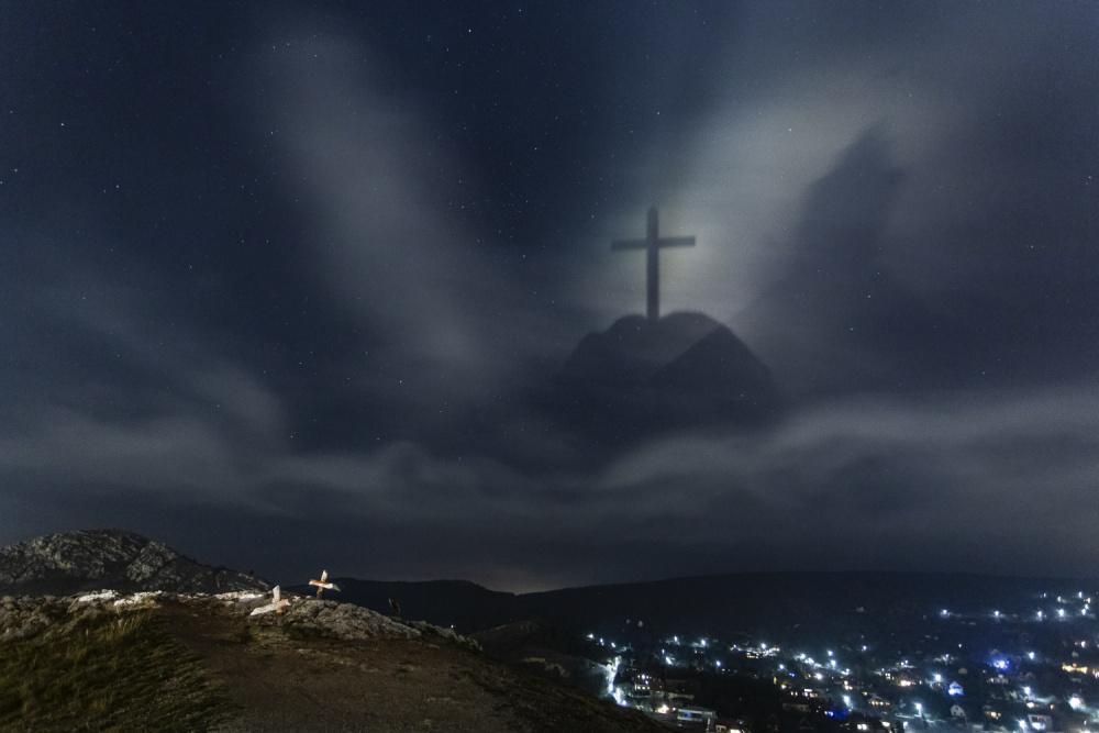 Az elmúlt években több éjszakát töltöttem hullócsillagok fényképezésével. Egy decemberi napon a budaörsi Kő-hegyen a Geminida-meteorrajt szerettem volna fényképezni az éjszakai városképpel. Az első sikeres expozíció után új nézőpontot kerestem. Hátat fordítottam a városnak, s arra lettem figyelmes, hogy valami kezd kirajzolódni az égbolton. Felélénkült a légmozgás, és pár alacsonyan érkező felhő beúszott a budai hegyek fölé – ekkor tárult a szemem elé a képen látható jelenség. A megvilágításnak köszönhetően a Kő-hegy csúcsán található kereszt és a tőle nagyjából száz méterre lévő Szeplőtelen Fogantatás-kápolna sziluettje hatalmas méretekben jelent meg az égen, egymásra vetülve. A jelenség alig pár percig tartott, először a templomtorony, majd a kereszt is elhalványult.