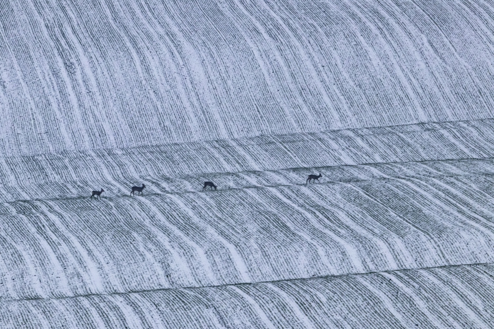 Ezt a fényképemet egy nagyon szép mátraaljai település, Rózsaszentmárton határában készítettem. Januárban egy egész napos, de eredménytelen fotótúra végén fáradtan és átfázva kullogtam vissza a kocsimhoz, amikor megláttam a legelésző őzeket a szemközti búzatáblában. A kép tetszett, de nem volt jó a kompozíció. Közelebb mentem, és vártam, hátha lesz jobb beállásuk is az addig összevissza legelésző állatoknak. Egyszer csak vonalba rendeződtek, és legelészve elindultak egymás után az egyik dombocska gerincén.