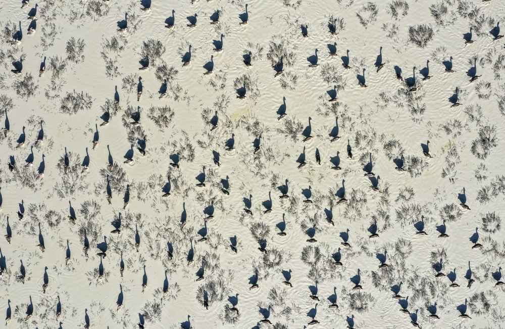 A téli időszakban nagy tömegekben jelennek meg a Kárpát-medencében a vonuló nagy lilikek (Anser albifrons). A madarak előszeretettel keresik fel az alföldi szikesek vizes élőhelyeit, ahol nemcsak éjszakáznak, hanem napközben is megjelennek, hogy igyanak és pihenjenek. Ezen a képen egy sekély szikes tóban láthatóak a nagy lilikek az elszáradt magyar sóballák között. A vadludak árnyékai az elhalt növényzettel különleges látványt nyújtanak, egyben jól mutatják a csoportban az egyedek személyes territóriumait.