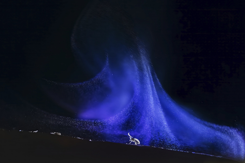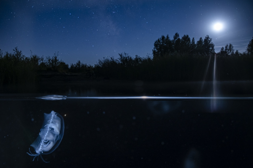 Édesvízi medúza a holdfényben egy kavicsbányatóban. Ez a kép multiexpozícióval készült, és a fényképezőgépet egy akváriumba helyeztem, hogy bele tudjam meríteni a vízbe. Először a medúzát fotóztam le, zseblámpával, ellenfényben megvilágítva. Ezt követően exponáltam a háttérre a csillagos eget.