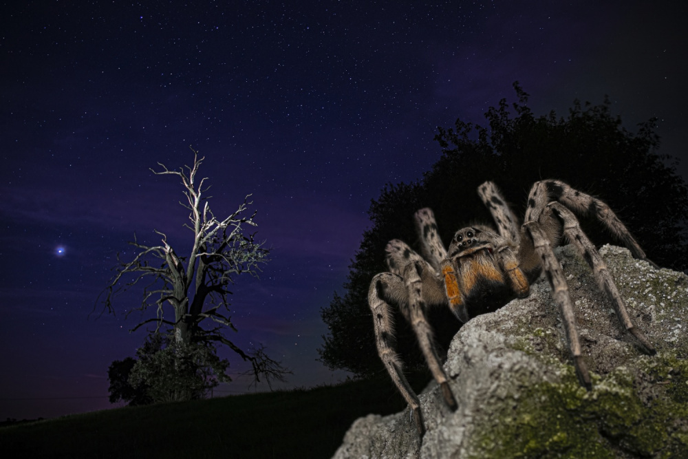 Nagyon szeretem J. R. R. Tolkien munkásságát, és különösen nagy hatással volt rám a hatalmas pók, Ungóliánt története, aki elpusztította azt a két fát, ami a világ népeinek a fényt adta, így csak a csillagok fénye maradt hátra. Ezt szerettem volna visszaadni egy fényképen, méghozzá hazánk legnagyobb pókfajával, a szongáriai cselőpókkal. Ehhez multiexpozíciót használtam. Először a pókot fotóztam le szűk rekesszel, vakufénnyel, majd ráexponáltam a képre a hátteret, amihez a tölgyfát a biciklim lámpájával világítottam meg.