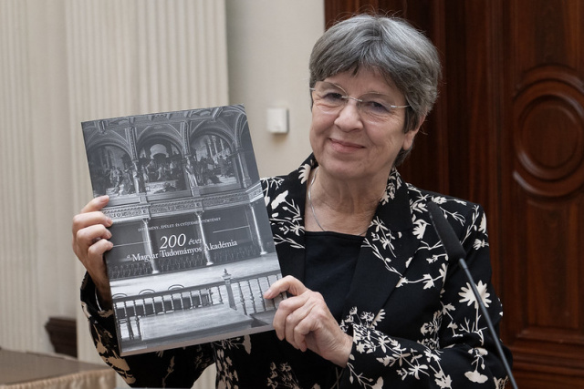 Hay Diana Fotó: mta.hu / Szigeti TamásHay Diana, a Magyar Tudományos Akadémia Könyvtár és Információs Központ Akadémiai Levéltárának igazgatója, aki szerzőként is részt vett, mind az első, mind a második kiadás létrehozásában, a 20. századi történelmi eseményekről készült fotók között válogatva azt illusztrálta, hogy milyen volt az Akadémia és a tér viszonya, hogyan kapcsolódtak össze a székházban zajló események az épületen kívüli tér és a tágabb környezet történéseivel 1918 októberétől egészen a Határtalan történet című, 200 tardosi nemes mészkő lap alkotta idővonal 2025. májusi átadásáig.