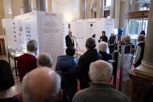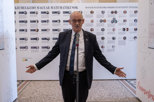 Páles Zsolt köszönti a hallgatóságot. A képre kattintva galéria nyílik. Fotó: mta.hu / Szigeti Tamás„Sokan tudják az itt jelen lévők közül, hogy tavaly és idén a Magyar Tudományos Akadémia megalakulásának, megalapításának 200. évfordulóját ünnepli. Ezt a két évet az Országgyűlés a magyar tudomány évének nyilvánította, melynek keretében minden hónapban az MTA valamelyik osztálya kapja meg a székházat, és tölti meg az osztályhoz illő tartalommal” – mondta Páles Zsolt, aki a kiállításon túl a matematikai osztályhónap további programjaira is felhívta a figyelmet. Kedd esténként az úgynevezett „MatMozi” keretében négy filmet mutatnak be. „Este 6 órakor kezdődnek a vetítések, Bolyai Farkasról, Neumann Jánosról és Erdős Pálról láthatunk majd filmeket. Az osztály újonnan megválasztott levelező és rendes tagjainak székfoglaló előadásaira is sor kerül a hónap folyamán, ezeken kívül kis konferenciák valósulnak meg informatikai, számítástudományi, számelméleti és operációkutatási tartalommal” – sorolta Páles Zsolt, kiemelve, hogy a matematikai tehetséggondozásnak külön eseményt szentelnek: a Bolyai Társulat 2025. évi díjai, illetve az azt megelőző előadások a diákolimpikonokról, a diákolimpiákon sikeresen szereplő magyar diákokról, az őket felkészítő tanárokról is szólnak.