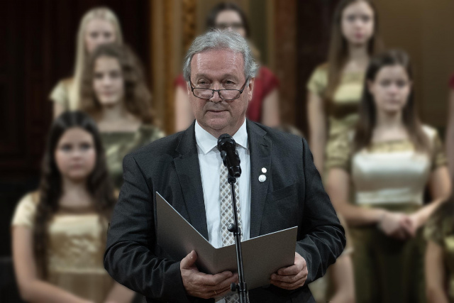 Szabó Dénes a Pro Musica Leánykart vezényli a Művészeti estek a Magyar Tudományos Akadémián XVI. estjén (2025. december 8.) Fotó: mta.hu / Szigeti TamásFreund Tamás ünnepi köszöntője teljes egészében itt olvasható.