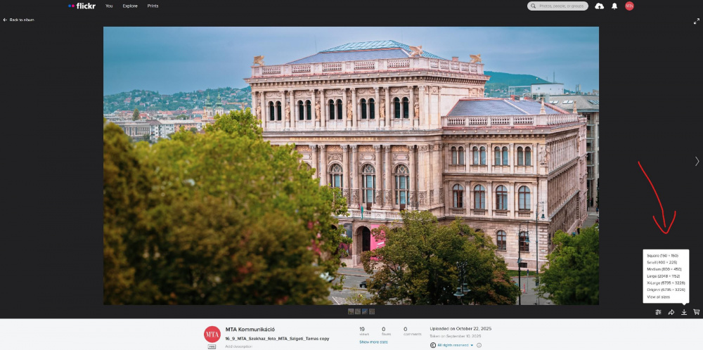 A képek letöltése egyszerű, adott fotót megnyitva a jobb alsó sarokban látható letöltés ikonra kell kattintani, majd a felugró menüben kiválasztani a letöltendő kép felbontását, lásd az alábbi képen.