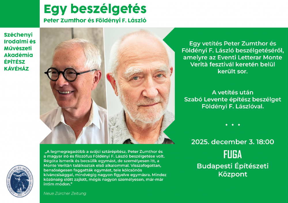 2025. december 3-án (szerdán) 18 órától vetítés Peter ZUMTHOR és FÖLDÉNYI F. László beszélgetéséről, majd annak kapcsán SZABÓ LEVENTE beszélget FÖLDÉNYI F. LÁSZLÓVAL az Építész Kávéház keretében a FUGA Breuer Marcell termében (1052 Budapest, Petőfi Sándor utca 5.).