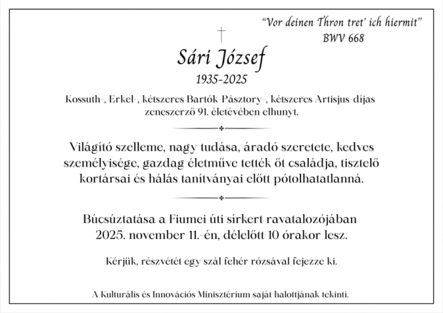 Mély fájdalommal tudatjuk, hogy Sári József, Kossuth-díjas zeneszerző, a Széchenyi Irodalmi és Művészeti Akadémia rendes tagja