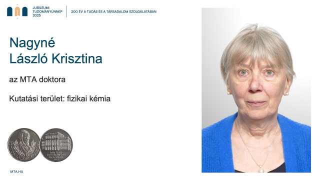 Nagyné László Krisztinát, a Magyar Tudományos Akadémia doktorát, a Budapesti Műszaki és Gazdaságtudományi Egyetem Fizikai Kémia és Anyagtudományi Tanszék professor emeritáját a gázalapú energiatárolásra, valamint a platinamentes üzemanyagcella-katód kialakítására felhasználható, továbbá a nanostrukturált pórusos szenek felületkémiájának a határfelületi jelenségekben játszott szerepének tanulmányozása során elért, nemzetközi szinten kiemelkedő kutatási eredményeiért;