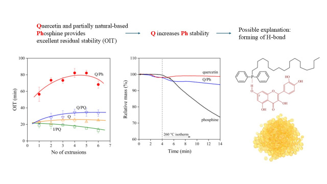 A szerzők kvercetinből és egy újonnan kifejlesztett, részben bioalapú foszfin antioxidánsból álló adalékanyagcsomagot alkalmaztak polietilén stabilizálására, és a hatékonyságát összevetették egy ipari stabilizátor kombinációval. Az összehasonlítás azt mutatta, hogy a bioalapú csomag számos előnnyel rendelkezik a jelenleg használt ipari összetételhez képest; kisebb adalékanyagtartalom mellett jobb stabilizációs hatékonyság érhető el. A felhasznált természetes antioxidáns, kölcsönhatásba lép a másodlagos stabilizátorokkal. A kvercetin növeli az újonnan szintetizált foszfin antioxidáns stabilitását.