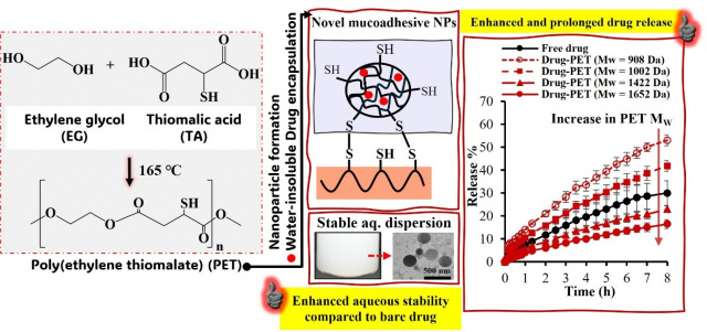 A szerzők olyan katalizátormentes módon előállított, biokompatibilis és mukoadhezív tulajdonságú tiolált-poliészter alapú nanorészecskéket mutattak be, amelyek alkalmasak a vízben rosszul oldódó hatóanyagok, pl. a metilprednizolon-acetát becsomagolására, majd szabályozott felszabadulásának biztosítására. A nyálkahártyához tapadó részecskék segítik a felszívódást, így hatékonyabb szájon át történő kezelési lehetőséget kínálnak gyulladásos bélbetegségek, például a Crohn-betegség esetén.